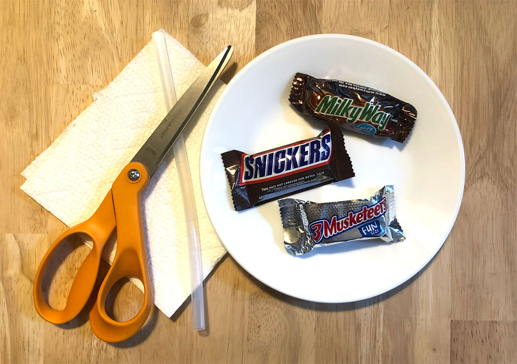 This activity works best with candy bars that are at or slightly above room temperature. If the candy bars are too cold, it will be hard to poke a straw through them, and they will crunch or break. If they are too warm, they will be squishy and gooey, making it difficult to get a nice sample. If necessary, briefly put your candy bars somewhere to raise or lower their temperature. For example, you can put them in the refrigerator for a few minutes to chill them or leave them on a sunny windowsill to warm them.