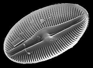 Diatoms are one of the single-celled types of algae. Pictured is a scanning electron micrograph image of Diploneis puella.