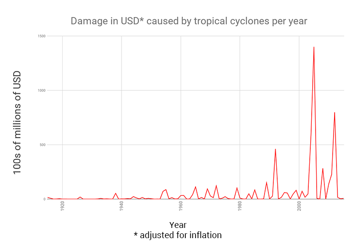 1. Describe the trends over time shown in this graph, in terms of how much damage hurricanes are doing?