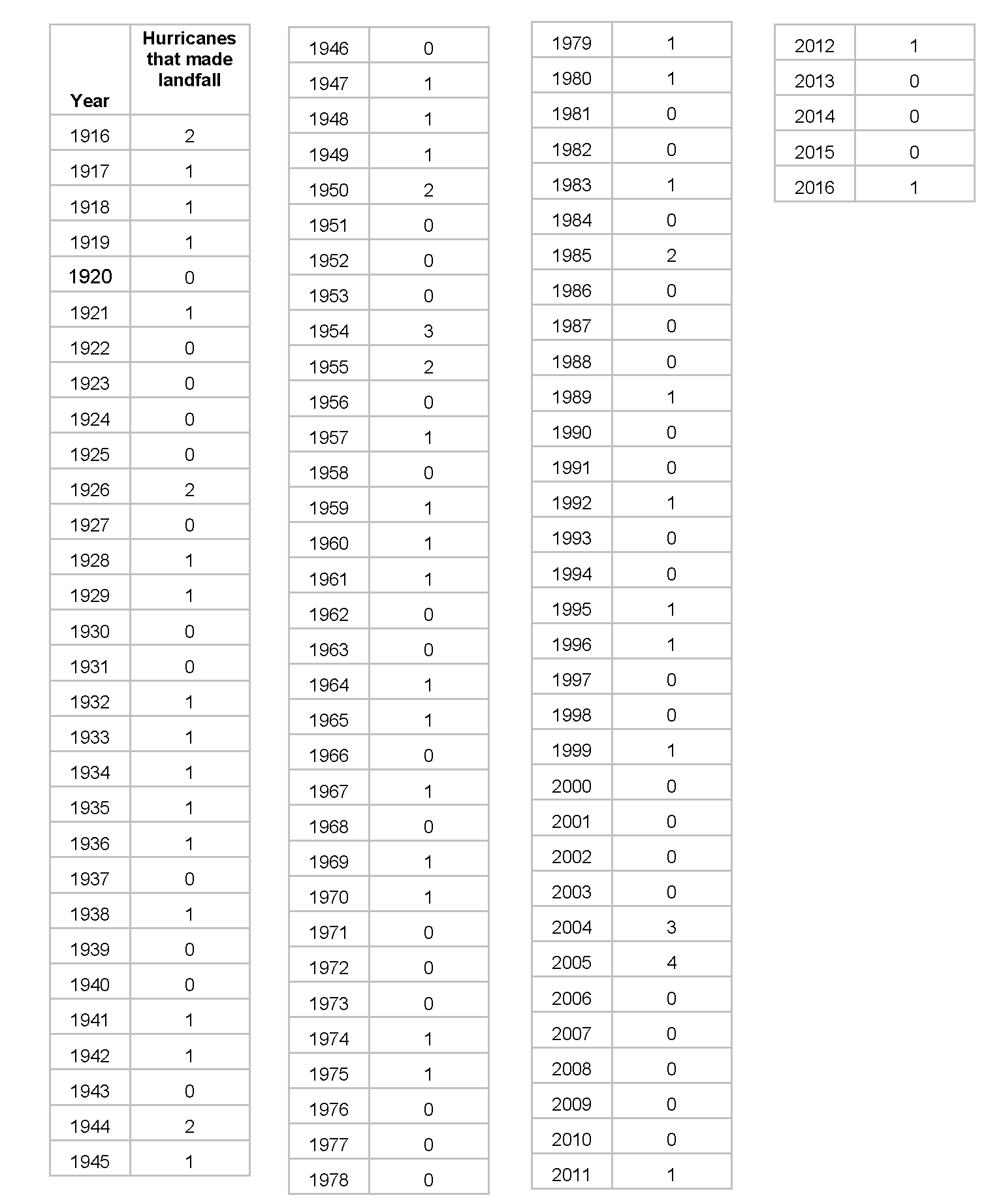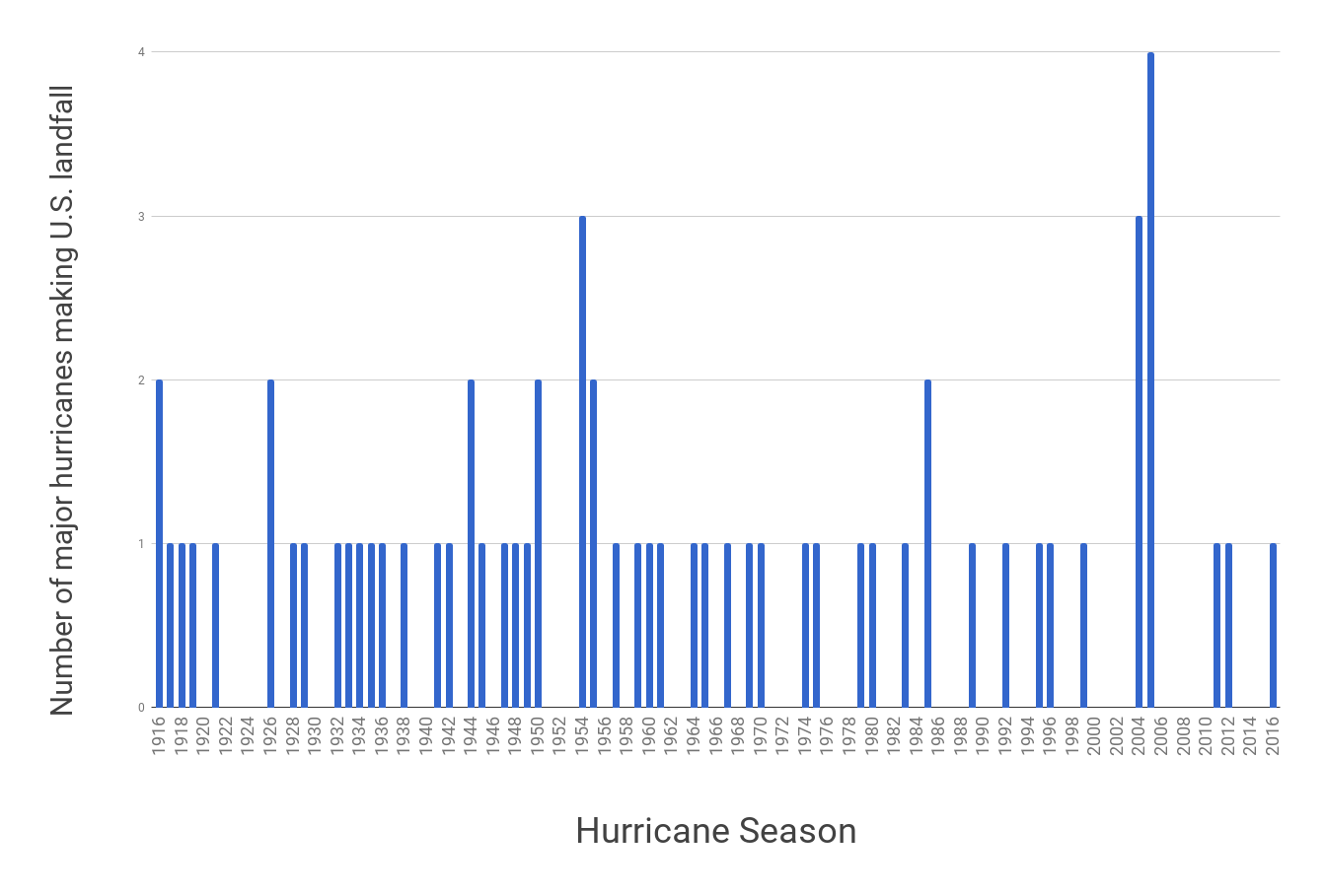 The graph below tracks how many major hurricanes made landfall on the East Coast of the United States. Major hurricanes are those storms that reach category 3 or higher on the Saffir-Simpson Hurricane Wind Scale. These will have sustained wind speeds greater than 178 kilometers (111 miles) per hour. The data behind the graph come from the Hurricane Archive at Weather Underground. It’s a weather-forecasting website. (Here is a table of the data used to compile the graph below.)