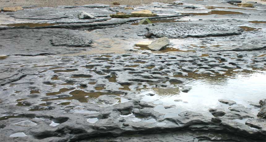 A waterlogged hominid footprint is shown above a camera’s lens cover. This print was one of dozens that appeared briefly at an ancient coastal site in England. Strong ocean waves eroded the hard silt that had covered them for perhaps 1 million years.