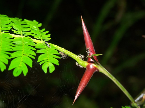 In return for this protection, the tree provides the ants a good home. The insects live within hollow cavities in thorns, twigs, stems or the trunk. The tree also provides food. Ants sip a sweet liquid produced by glands at the base of the tree’s leaves. The ants even dine on nodules of fat and protein on leaf tips.