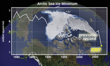 Last summer, Arctic sea ice reached its skimpiest levels yet. By the end of summer 2007, the ice had shrunk to cover just 4.2 million square kilometers (1.6 million square miles). That’s 38 percent less area than the average cover at that time of year. And it’s a whopping 23 percent below the previous record low, which was set just 2 years ago. This continuing trend has scientists concerned.
