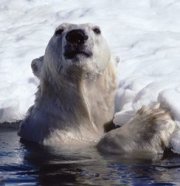 A polar bear surfaces to look for its cub.