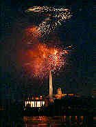 Fireworks at the National Mall, with a view across the Potomac River toward the Washington Monument and the Lincoln Memorial.