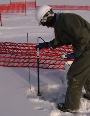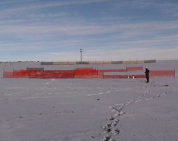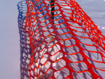 In three other areas, she used a new type of fence, called a snow snake fence. These orange, plastic, weblike structures catch less snow than the wooden fences, but Erica thought they might help distribute snow into smaller, but more even, piles. In one of these sections, she placed just one snow snake fence. In another, she put one snow snake fence 18 meters (59 feet) behind another.