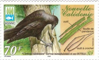 This New Caledonian stamp honors a crow species that makes tools (at right).