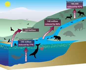 As the numbers of whales and fish have been falling, fewer ocean nutrients have been reaching the land. Of nutrients that do, fewer are traveling inland as fast as they once did.