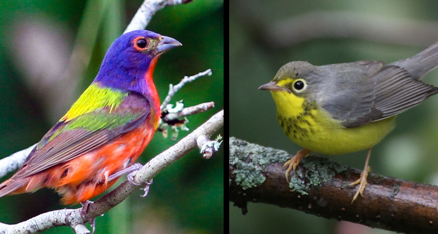 On the left is a painted bunting. On the right is a Canada warbler. Such birds that migrate between continents are more likely to smash into windows, according to a new study. The study also turned up the surprising finding that lower-rise buildings — not skyscrapers — are responsible for the vast majority of bird deaths by window.
