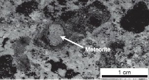 This sample drilled from rock contains a piece of the asteroid (arrow) that blasted a crater in the Kalahari Desert in Africa 144 million years ago. |