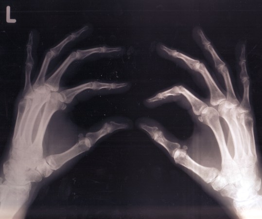 Bones, shown here in an X-ray, appear white because of the calcium they contain.