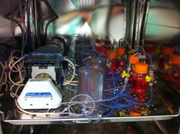 Researchers at Columbia University grow custom bones in the gray-colored tanks at center. A pump (left) bathes the bone cells with special fluids and nutrients (red-colored liquid, right) to help them grow.