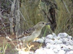 A male spotted bowerbird usually decorates his bower with white shells outside the entrance and a scattering of other keepsakes.