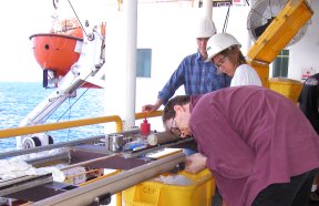 Kai-Uwe Hinrichs examines a sample taken from a cylinder of sediment drilled out of the ocean floor.