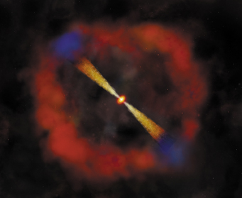 In this model of a gamma-ray burst, jets of high-energy particles emerge from a rapidly rotating black hole (center) and then slam into surrounding matter.