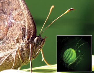 The brownish eye of this African tropical butterfly glows green when exposed to ultraviolet light (inset) after scientists added a jellyfish gene to the butterfly’s genetic makeup.