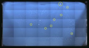 The yellow circles mark spots where large particles entered this aerogel tile, which is 4 centimeters long and 2 centimeters wide. |