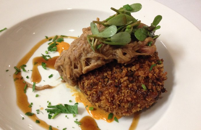 The recipe Blancher used to cook the pig was a variation of a traditional Cajun dish. A toasted cake of pork was topped with a preparation similar to pulled pork. Our meat came topped with another sprinkling of purslane.