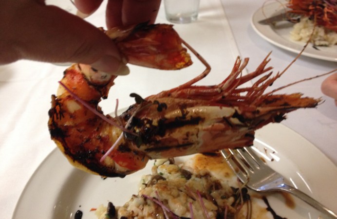 The centerpiece of the meal’s next course was a charbroiled tiger prawn. These hand-sized mega-shrimp are native to Southeast Asia. Since arriving in the Gulf of Mexico, they have been reviled for cannibalizing native shrimp species. Blancher served the meaty, smoke-flavored prawn whole (so yes, you had to snap off the head and shell it before eating). The crustacean arrived covering a heaping helping of risotto, a rice dish containing wild mushrooms and flavored with truffles.