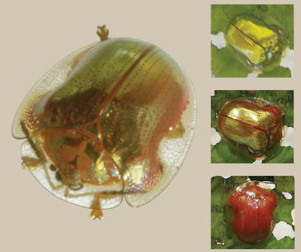 Pictured at the left is a golden tortoise beetle. The images at the right, from top to bottom, show how the beetle uses its shell structure to turn from gold to red.