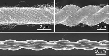 A forest of carbon nanotubes (top and right) is pulled into a cobweb-like sheet, then twisted into a yarn (bottom left).
