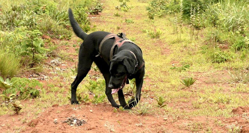 Sam Wasser’s team has trained dogs to search for the poop of rare animals. Here, a dog named Mason finds maned wolf dung in Brazil.