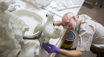 Slowing the time-related breakdown of aging artifacts is just one of the challenges that museum conservators face. Sometimes they have to repair valued items that have sustained damage over the years. That includes a huge fountain at the Victoria & Albert Museum in London. It depicts the god Neptune with his bride being pulled on a chariot made of seashells. The sculpture is made of porcelain, a famous kind of hard white china. But when the museum acquired it in 1870, it consisted of a mound of broken pieces — more than 150 in all.