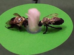 In a setup to test social learning, a bumblebee (left) feeds at a cotton wick soaked with sugar water that sticks out of a green paper flower. The fake bee (right) is positioned to look like a feeding bee.
