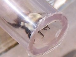 A bumblebee inside a plastic tube watches through the porthole as other bees feed on artificial flowers.