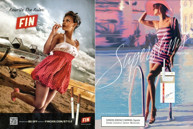 Which ad is selling a tobacco product and which is selling e-cigarettes? It’s hard to tell just by a quick look at the promotional materials. But the woman on the left is vaping and the Virginia Slims ad is trying to sell women on conventional cigarettes.