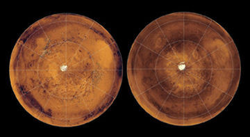 These pictures of the southern half of Mars show that the planet got darker between the late 1970s (left) and 2000 (right). At the center of each image, in white, is the ice cap at the planet’s south pole.