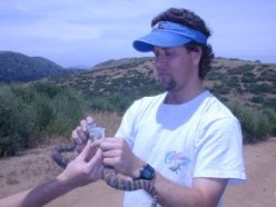 Bill Hayes extracts venom from an adult speckled rattlesnake (Crotalus mitchelli).