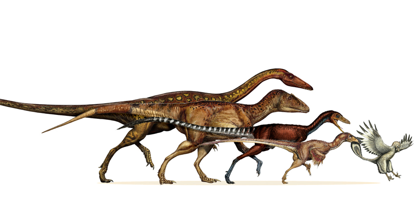 The dinosaur ancestors of birds shrank steadily for more than 50 million years. Left to right: a neotheropod (from about 220 million years ago), a tetanuran, a coelurosaur, a paravian and finally Archaeopteryx (from 150 million years ago).