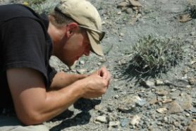 Geologist Cris Merta examines a tiny fossil fragment.