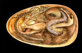 In this illustration based on a fossil, an artist shows a prehistoric baby bird’s position and features just before hatching.