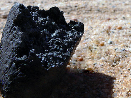 A meteorite from an asteroid tracked by scientists lies in the Nubian Desert in northern Sudan. The deep black color tells researchers that the rock is rich in carbon.