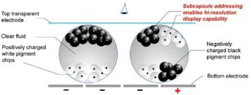 A microcapsule of electronic ink contains black and white particles. When the bottom electrode has a negative charge, it attracts the positively charged white particles. Black particles are left on top, so the top of the microcapsule appears black (left).