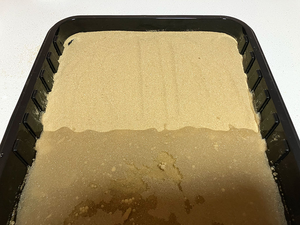 3. Slowly pour 6 cups of water into the deep end of the pan. Let the water and sand settle for five minutes.