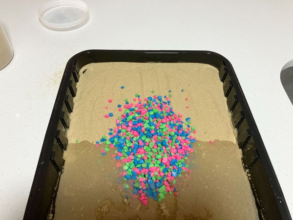 2. Build up a small beach with most, but not all, of the sand at the shallow end of the pan.