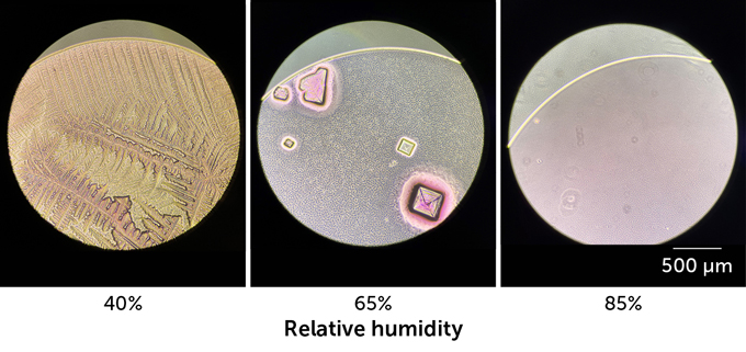 Viruses often travel through the air inside airborne droplets, or aerosols. When the air is dry, aerosols dry quickly (left). This drying encloses viruses in a layer of crystals that look like feathers (as this microscope image shows). That flash-drying protects viruses, although scientists don’t know exactly how. At medium levels of humidity, crystals form inside liquid droplets (middle). Those crystals may inactivate viruses, not protect them. At high humidity levels (right), aerosols remain liquid. This also allows viruses to survive better than at mid-level humidity.