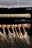 This velociraptor dinosaur’s forearm bone (top) has regularly spaced bumps, similar to those on the forearm bone of a modern turkey vulture (middle and bottom). These bumps show where large feathers were probably attached.