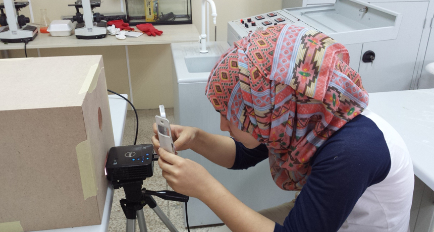 Research by 9th-grader Hadaia Azad Ezzulddin, from Erbil, Iraq, suggests that infrared lights embedded in theater screens could help cut down on movie piracy. Here, she tests her idea using an iPhone to take pictures of images projected onto a tiny movie screen.