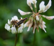 A firefly rests on white clover.