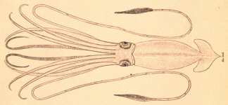 This drawing of a giant squid was based on a specimen found on the coast of Newfoundland in 1874. |