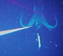 On Sept. 30, 2004, one of these cameras recorded the pale form of a giant squid as it attacked the bait. Giant squid have eight arms plus two extralong tentacles. The photographed creature wrapped the ends of its paired tentacles around the bait, and one tentacle snagged on the hook. The camera caught images of the squid fighting to free itself.