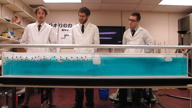 Burton’s team floated their plastic icebergs in the water tank, flipped them over, and then measured the waves.
