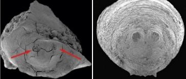 A fossil pupa fragment (left) found in Antarctica has a pair of spiracles, or breathing holes (arrows), which marks its species as similar to modern blowflies (pupa, right).