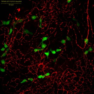 Nosey tasters: Taste cells on the inside of the nose of a genetically engineered mouse appear green under the microscope. Those taste cells talk to the treelike branches of nerve cells, which are red in this picture.