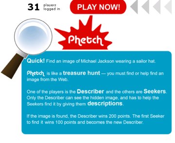 The game Phetch is an online treasure hunt that matches descriptions with images. |