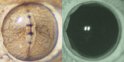 A gecko’s pupil is nearly closed in bright light (left) and wide open in dim light (right).